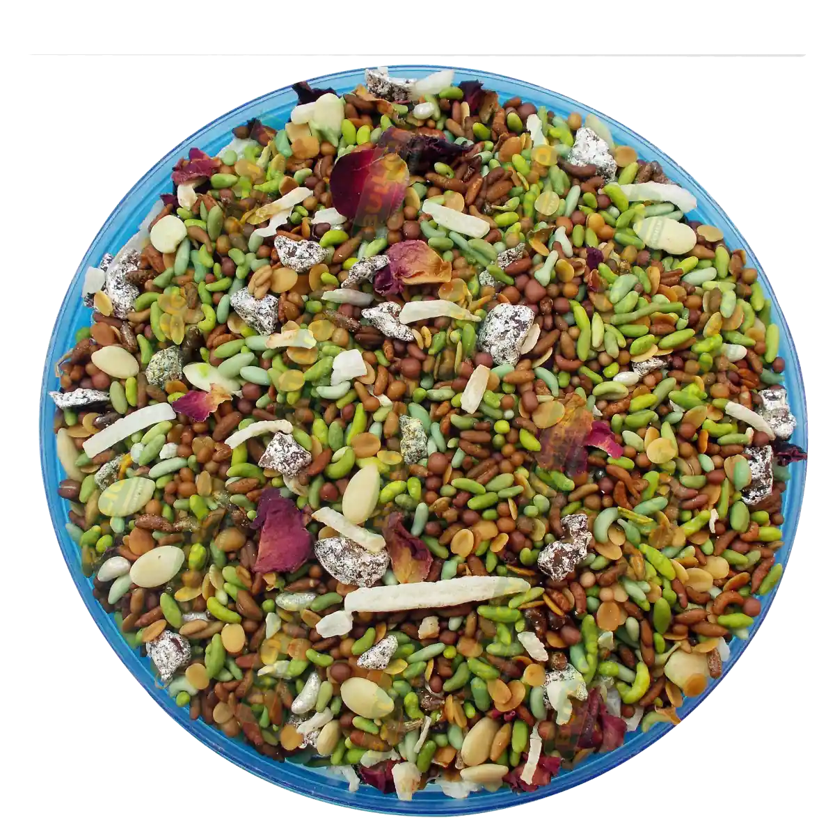 A luxurious, traditional Indian mouth freshener, a crunchy, aromatic blend of seeds (fennel, coriander, watermelon), nuts (coconut), dried fruits (dates), rose petals, cardamom, and sugar, often with silver leaf and mint for a regal, cooling, post-meal digestive treat that freshens breath and aids digestion with its mix of sweet, spicy, and earthy notes.